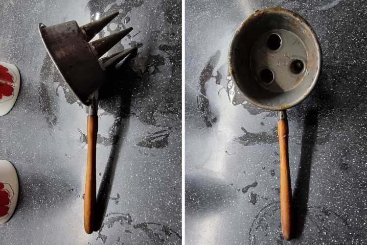 Вопрос: «Кухонная утварь с деревянной ручкой, прикрепленная к круглой металлической чашке с 3 шипами (с отверстиями)»