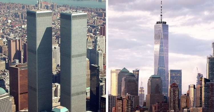 Башни-близнецы Всемирного торгового центра до атаки в 2001 году и Башня Свободы, открытая в том же районе Нью-Йорка в 2014 году.