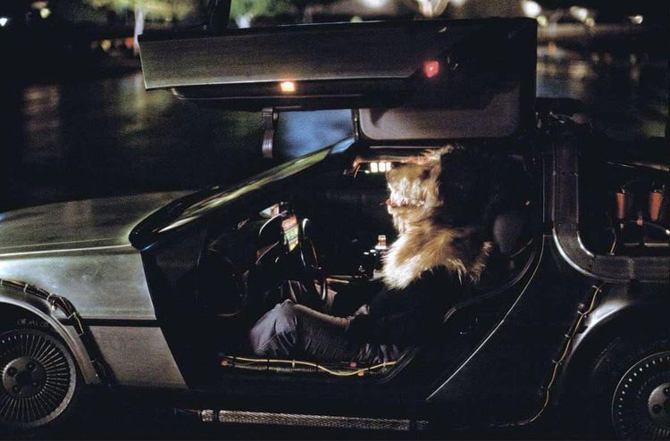 Каскадер в собачьем костюме Эйнштейна на съемках фильма «Назад в будущее»
