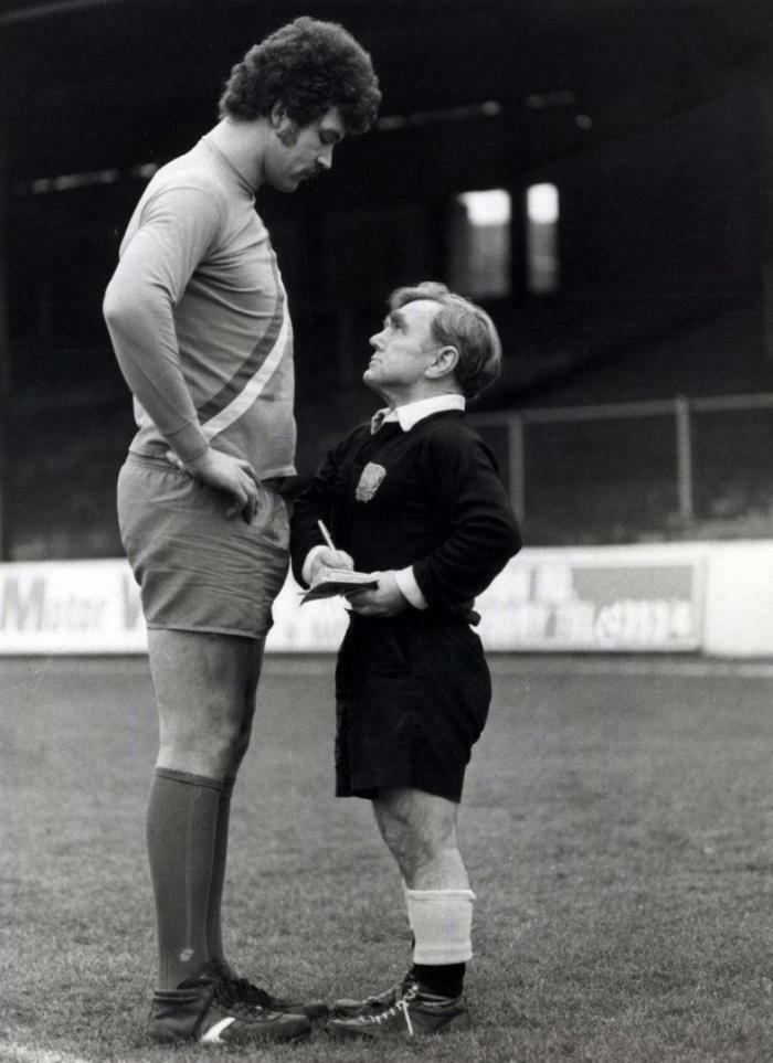 Арбитр Джоуи Шаклфорд (рост 1,46 м) выносит предупреждение Клайву Годдарду (рост 2,06 м), Англия, 1980 год