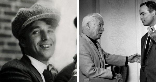 Чаплин на съёмках своего первого полнометражного фильма «Малыш» (1921) и на съёмочной площадке фильма «Графиня из Гонконга» (1967), в котором снялись Марлон Брандо, Софи Лорен и Типпи Хедрен.