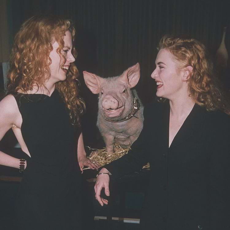 Николь Кидман и Кейт Уинслет с поросёнком Бэйбом на церемонии вручения премии «Оскар», 1995 год