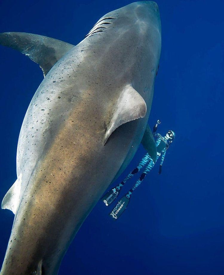 Дайвер по сравнению с самкой белой акулы, которая была обнаружена у побережья Гавайев