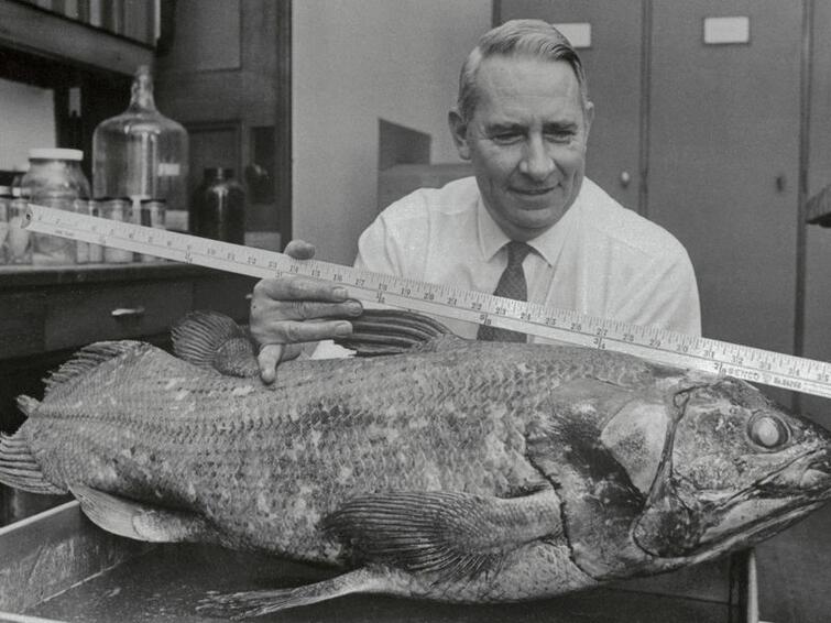 Куратор музея измеряет чучело латимерии, считавшейся вымершей 65 млн. лет назад, США, 1968 год