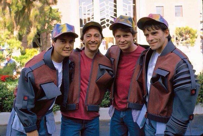 Майкл Джей Фокс со своими дублерами на съемках фильма «Назад в будущее 2», США, 1989 год