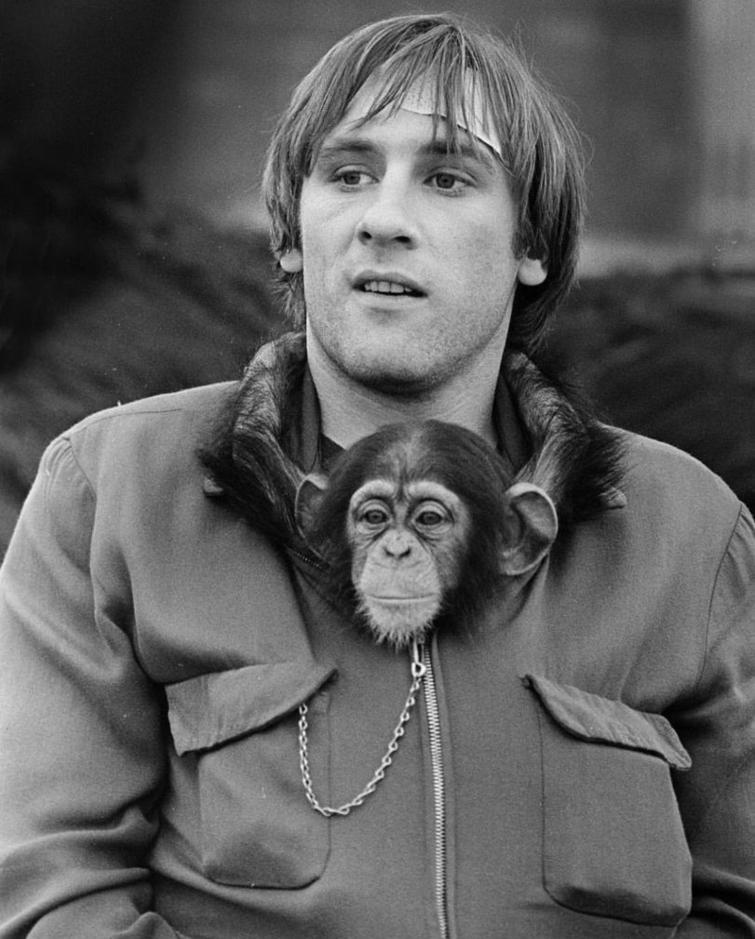 Жерар Депардье и его партнер Белла, девятимесячный шимпанзе, на съемочной площадке фильма “Прощай, самец”, 1977 год