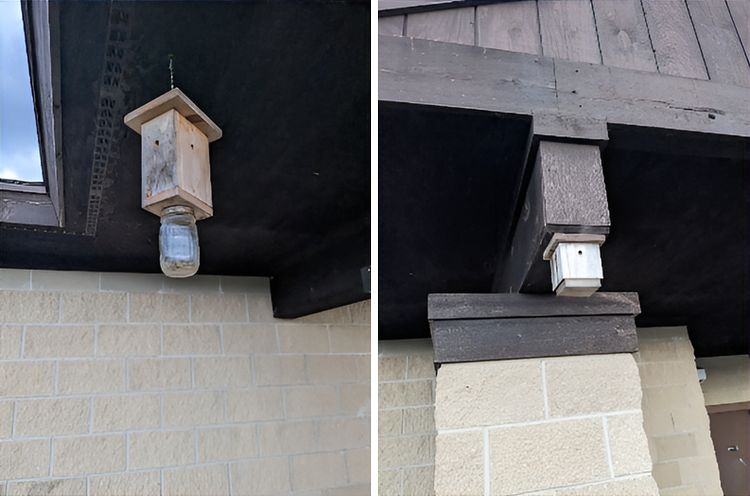 Ловушка с банкой работает следующим образом: пчёлы-плотники залезают внутрь домика, а потом продолжают двигаться на свет, залезая в банку, где они и остаются.
