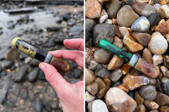 Вопрос: «Найдено на пляже города Чармут, графство Дорсет, Великобритания. Завинчивающаяся крышка, внутри ярко-зеленая жидкость»