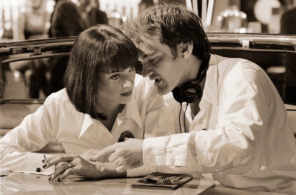 Ума Турман и Квентин Тарантино во время работы над фильмом «Криминальное чтиво» (1994).