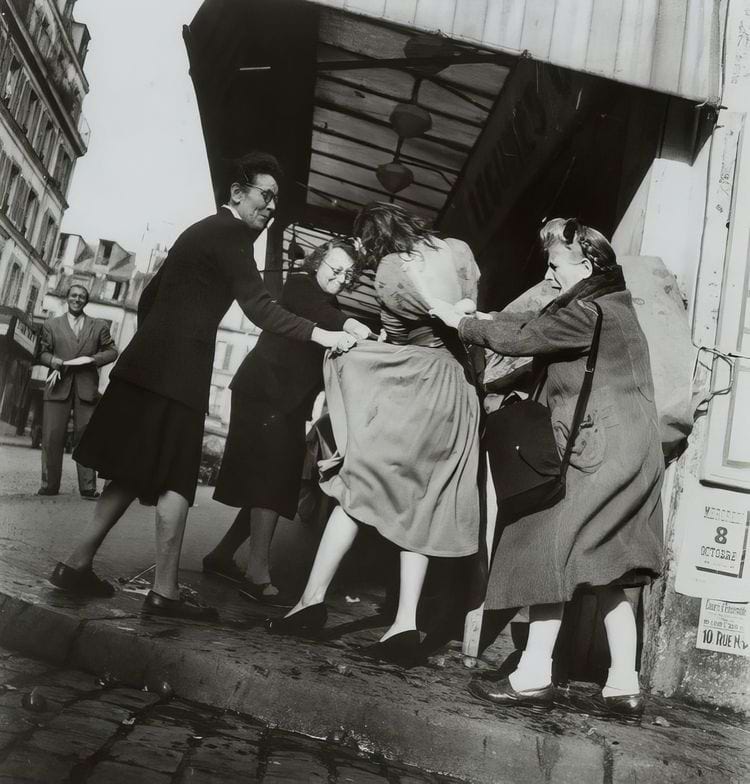 1947 год. Модели в платьях Кристиана Диора вызывают ажиотаж (а именно избыточное использование тканей в творениях Кристиана Диора)— парижанки буквально срывают наряды. В послевоенное время роскошь воспринималась как вызов бедности.