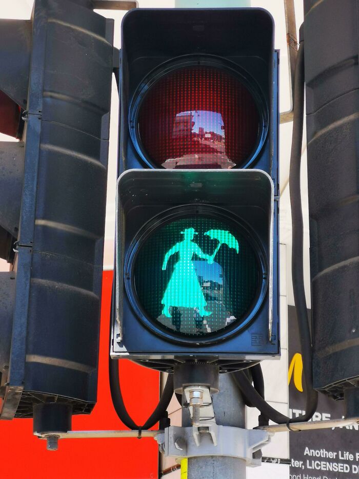 В Мэриборо, штат Квинсленд, Австралия, где родилась автор «Мэри Поппинс» П.Л. Трэверс, есть светофор с изображением переходящей дорогу героини её книги