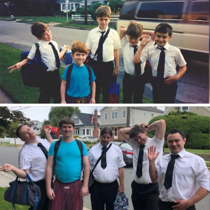 «К 60-летию моей мамы мы с родными братьями, двоюродным братом и мной воссоздали фотографию моего первого дня в детском саду»