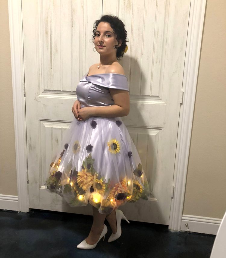 «Я сшила это платье для встречи выпускников без использования выкройки. Оно, к тому же, светится и я очень горжусь этой работой!»