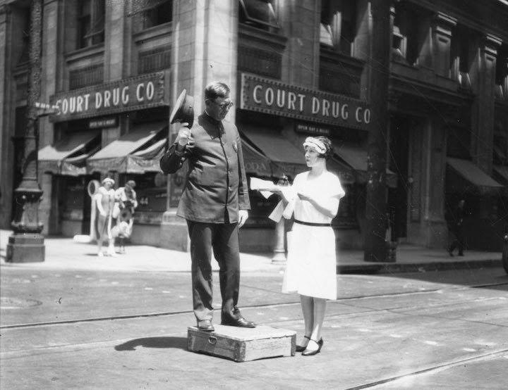 Регулировщик прерывается на чай. Пересечение Бродвея и 11-й улицы, Лос-Анджелес, 1927 год