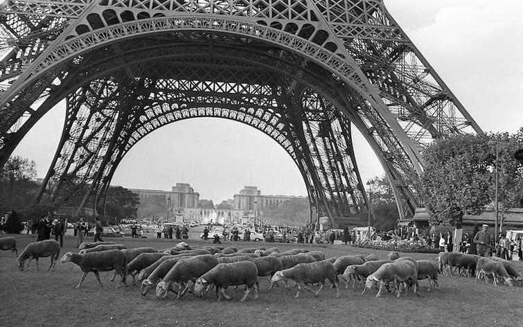 Французские фермеры и их овцы протестуют у Эйфелевой башни против строительства военной базы на своих землях, 1972 год