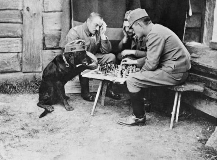 Австро-венгерские солдаты играют в шахматы с собакой