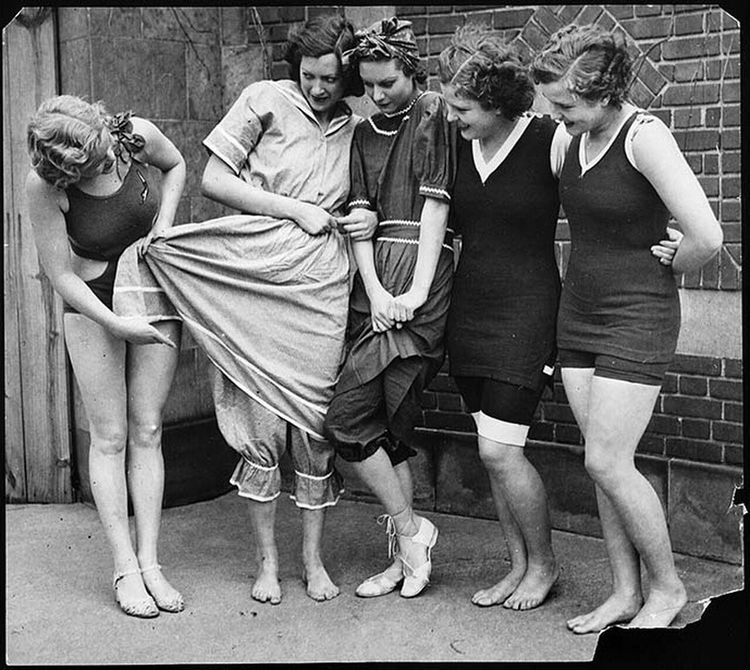 Эволюция женского купальника. Слева направо — 1932, 1890, 1900, 1910 и 1920-е года
