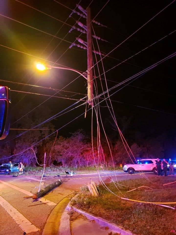 Во время аварии водитель снёс нижнюю часть столба, но, благодаря множеству натянутых проводов, он остался висеть в воздухе