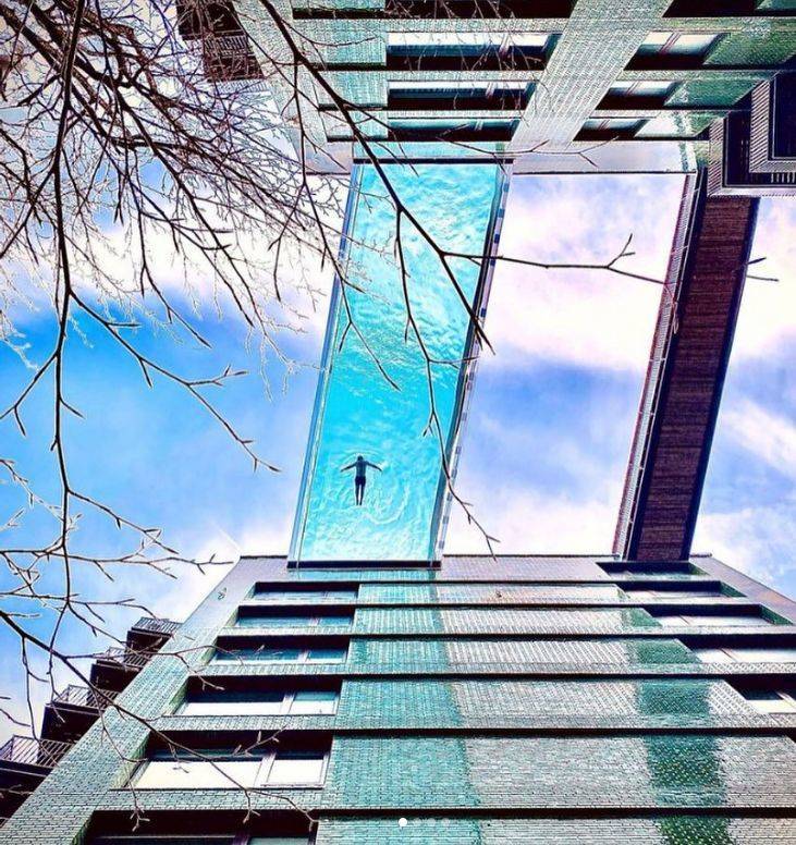 Бассейн с прозрачным дном, установленный между крышами зданий