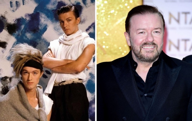 Рики Джервейс во времена участия в группе Seona Dancing и в 59 лет