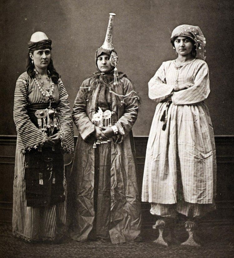 Любопытный головной убор замужней друзской женщины в центре называется «тантур». Он являлся аналогом нашего обручального кольца, поэтому носился круглосуточно. Несуразная обувь «каб–каб» на фото справа позволяла бесстрашно шлёпать по ближневосточной грязи, выглядя при этом выше и осанистей.