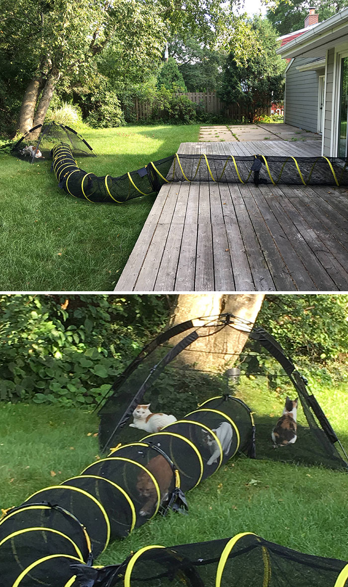 «Нашим кошкам нельзя выходить на улицу так как мы живем в районе, где обитают лисы и койоты, представляющие собой серьезную опасность. Поэтому мы сделали для кошек тоннель и палатку, чтобы они находились на улице и при этом в безопасности»