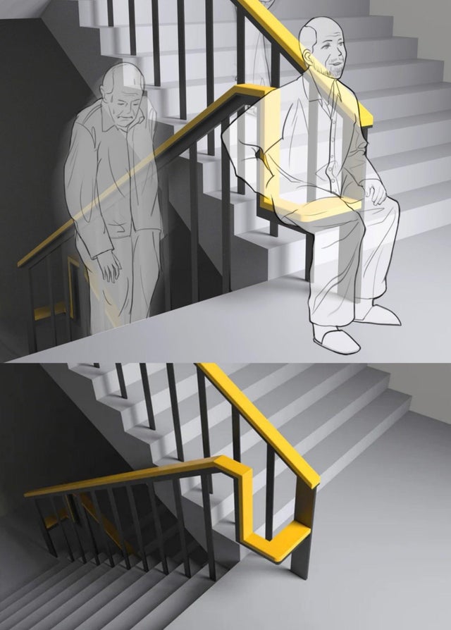 Перила лестницы со встроенными сиденьями на каждой лестничной площадке для тех, кому нужен небольшой перерыв перед подъёмом на следующий этаж