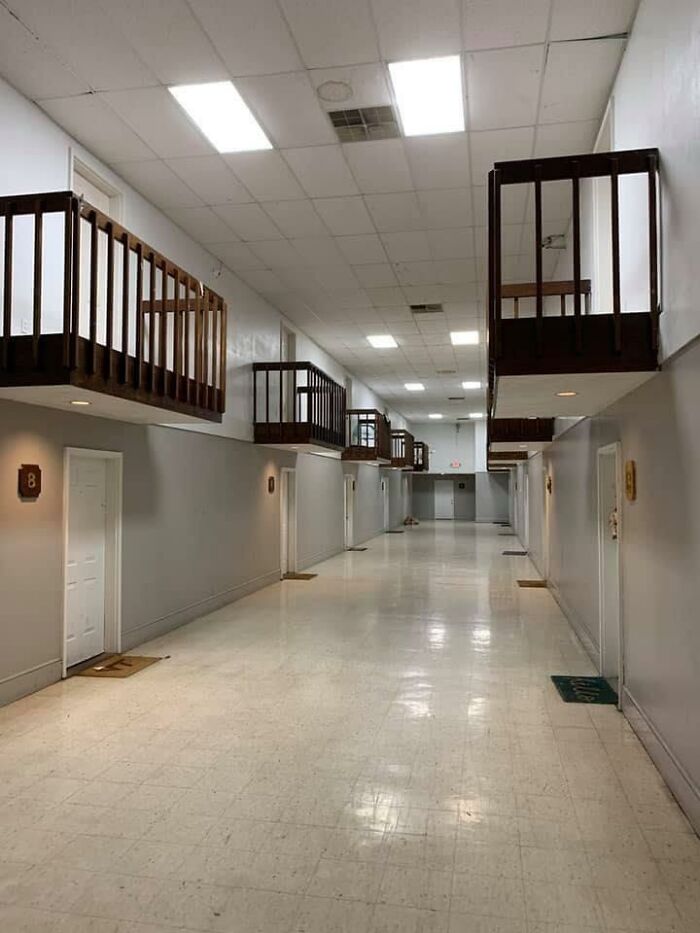 Как сообщается, эти квартиры расположены над торговым центром в городе Блэксберг, Вирджиния, США, в которых в основном живут студенты политехнического университета Вирджинии. Говорят, что несмотря на странные балконы, квартиры там классные