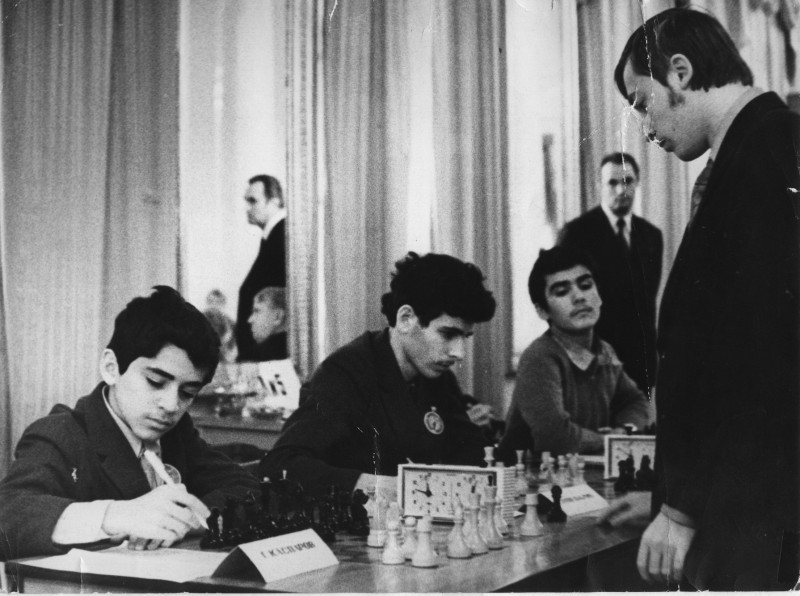 Сеанс одновременной игры Анатолия Карпова, слева 12–летний Гарри Каспаров, 1975 год, Ленинград