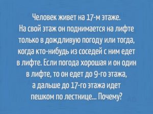 Этот человек очень маленького роста. До кнопки 17-го этажа самостоятельно он дотягивается только зонтиком или просит кого-нибудь нажать на эту кнопку.