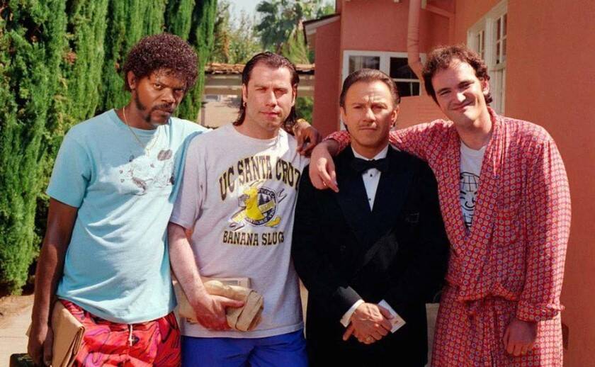 Сэмюэль Л.Джексон, Джон Траволта, Харви Кейтель и Квентин Тарантино на съемках “Криминального чтива”, 1993