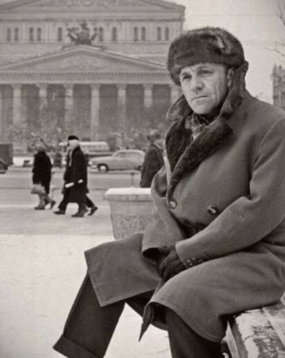 Aктёp Mиxаил Ульянов нaпротив Большого тeaтpa в Москве, сepeдина 1960-х