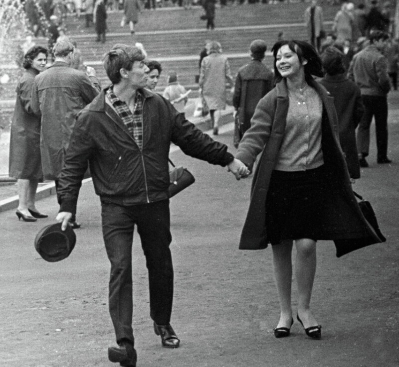Александр Збруев и Людмила Савельева во время прогулки по скверу у кинотеатра «Россия», 1966 год — лёгкий, живой кадр, в котором юность и романтика эпохи ощущаются в каждом взгляде.