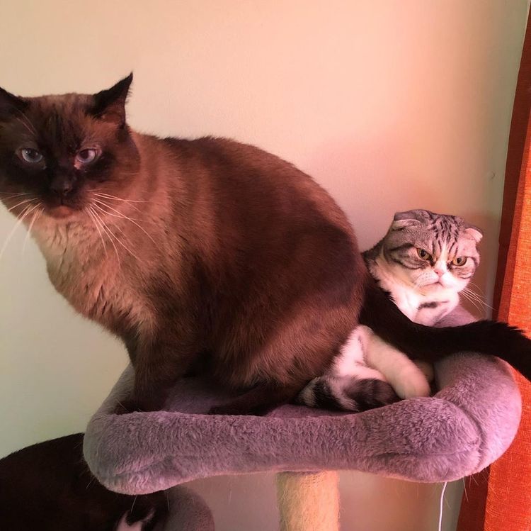 «Один мой вредный кот сидит своей пушистой задней точкой на другом моём вредном коте»
