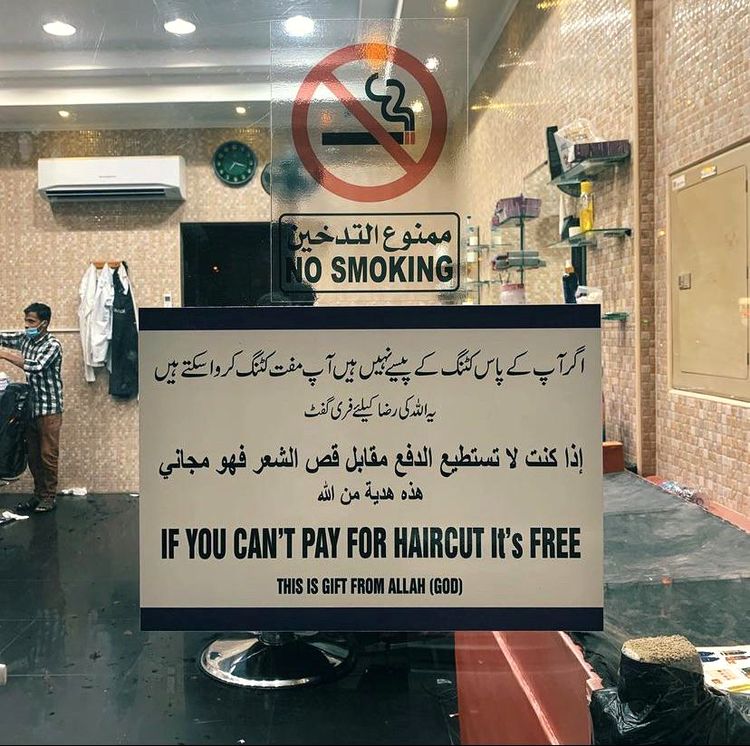 Объявление на двери парикмахерской: «Если вы не можете заплатить за стрижку — она бесплатная. Это подарок от Аллаха (Бога)»