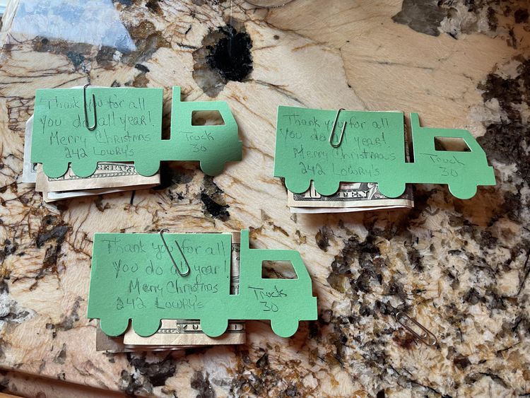 Мама автора фото даёт чаевые мусорщикам, прикрепляя к ним записку: «Спасибо за всё, что вы делаете круглый год! Счастливого Рождества! [адрес дома]»