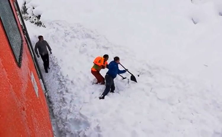 Двое австрийских железнодорожников спрыгнули с поезда и стали аккуратно выкапывать серну из-под снега, чтобы она смогла вернуться обратно в лес