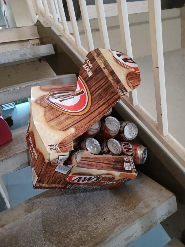 Есть способ справиться с этой проблемой: надо выпить все банки рутбира прямо сейчас. Во-первых, не придётся нести их на верх, а во-вторых, автор фото так сильно будет хотеть в туалет, что буквально взлетит вверх по лестнице