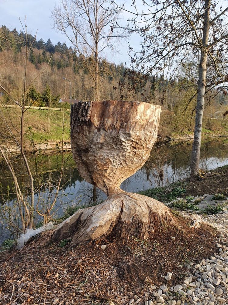 Предположительно, дерево спилили люди во время того, как им занимались бобры. Обычно бобры валят деревья, чтобы поедать кору и молодые побеги, но конкретно в этом случае, для них нет никакого смысла просто грызть деревяшку