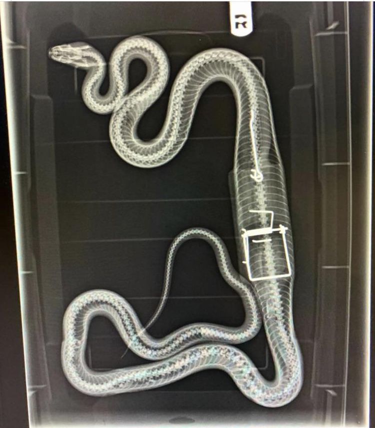 Змея съела мышь (или крысу) вместе с мышеловкой. Не видите грызуна на рентгеновском снимке? Это потому, что он уже переварился