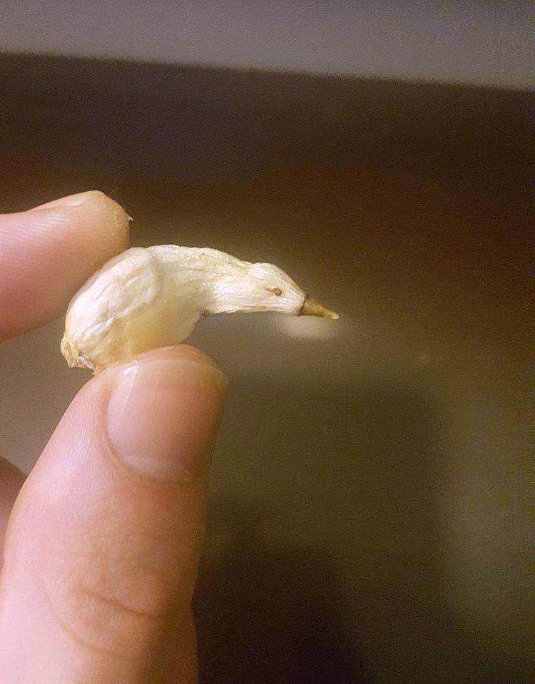 Это настолько выглядит как птица, что больше похоже, будто усохшая белая утка прикидывается долькой чеснока