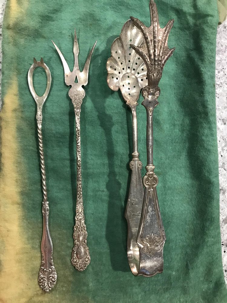 Вопрос: «Небольшая ложка с отверстием и шипами; вилка в виде трезубца; щипцы с куриной ножкой и перфорированной ложкой. Все — старинное серебро»
