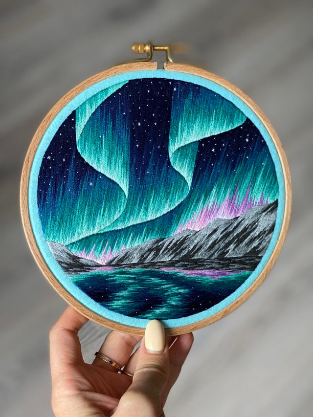 «Моя новая вышивка с северным сиянием! Мне нравится, какой она вышла»
