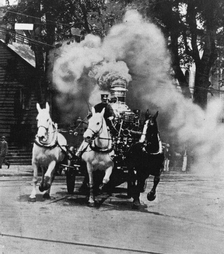 Пожарный экипаж с паровым насосом выезжает на тушение пожара, 1906 год