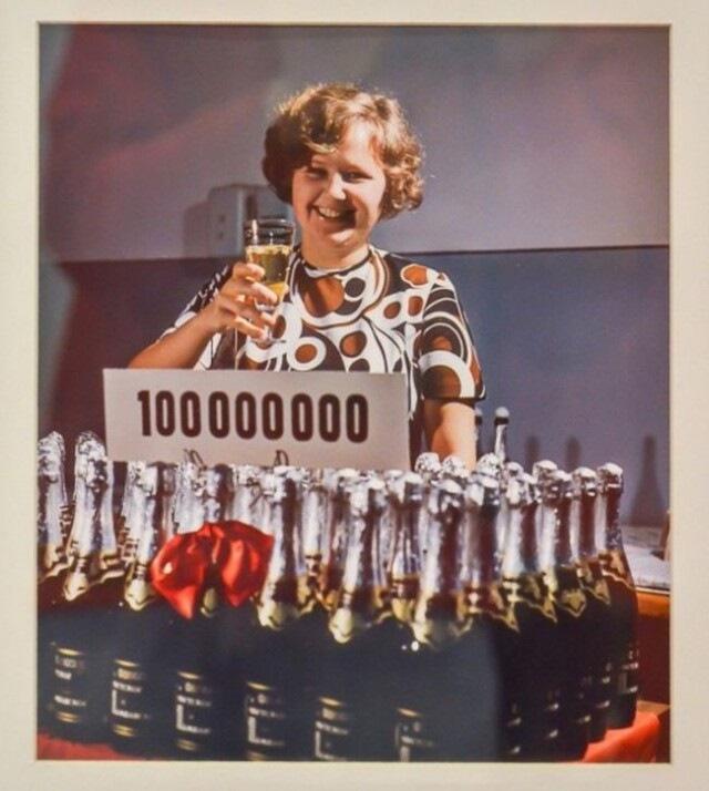 Стомиллионная бутылка советского шампанского. Работница завода с бокалом напитка, 1973 год