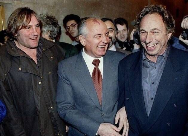 Михаил Горбачев с Пьером Ришаром и Жераром Депардье во время Недели французского кино в Москве, 1993 год