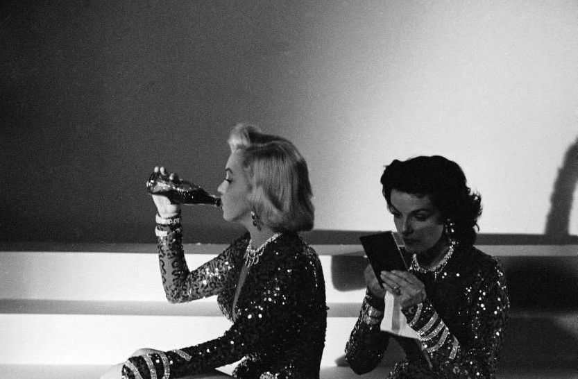 Мэрилин Монро и Джейн Расселл во время перерыва на съемках фильма “Джентльмены предпочитают блондинок”, 1952 г.