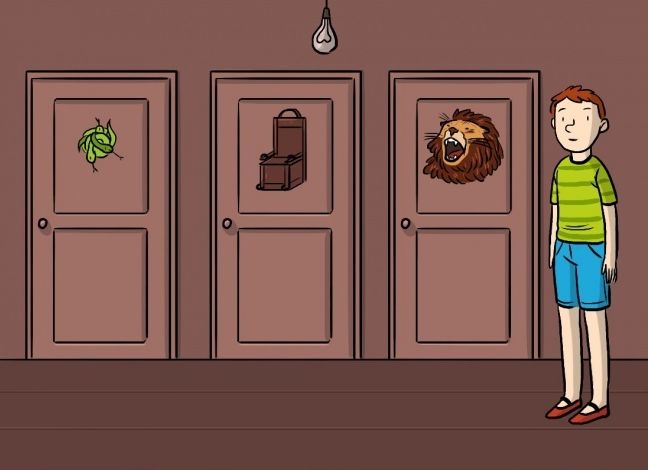 Гуляя по лесу, мальчик наткнулся на заброшенную хижину и решил зайти в нее. Как только он переступил порог, дверь захлопнулась и в домике воцарилась кромешная тьма. Мальчик нащупал на стене выключатель, щелкнул им, но электричества не было. И тут раздался страшный голос, который сказал, что выйти из хижины можно только через одну из 3 дверей, за каждой из них таится нечто смертельно опасное.За 1-й дверью — тысячи ядовитых змей, укус каждой из которых может убить человека. За 2-й дверью — электрический стул и палач, который тут же казнит мальчика.И за 3-й дверью — лев, который не ел уже много дней. Как мальчику выбраться из дома?