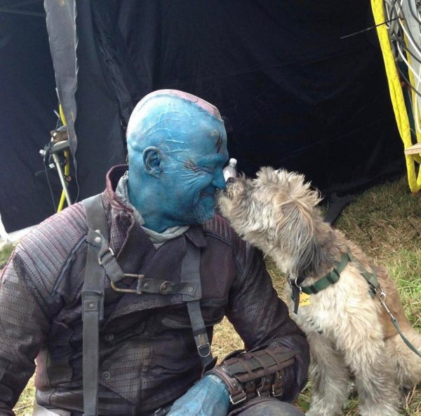 Майкл Рукер и собака режиссёра Джеймса Ганна за кадром «Стражей Галактики»