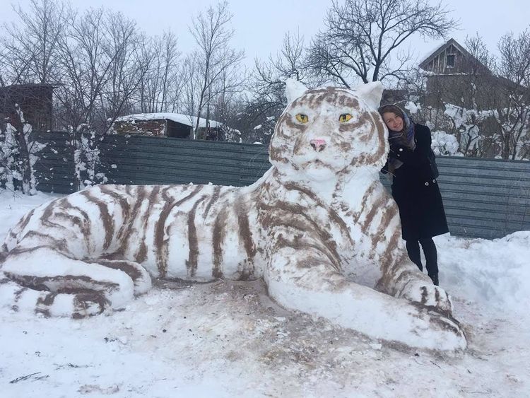 Снеготигр, который был вылеплен местной жительницей Ивановского района Одесской области